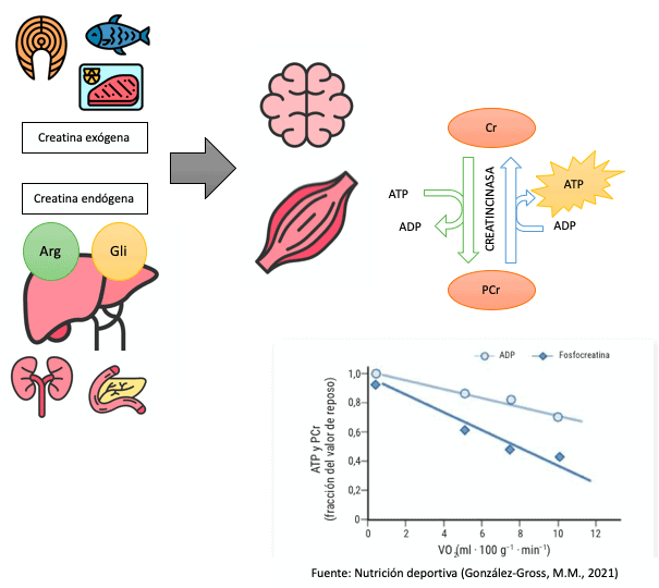 La PCr se forma a partir de Cr y esta se puede producir de manera endógena (por nosotros mismos, sin necesidad de añadir nada de fuera) a partir de dos aminoácidos, la arginina y la glicina. Su síntesis se lleva a cabo, mayoritariamente, en el hígado, pero también en páncreas y riñón. Una vez formada la creatina, esta viaja a través de la sangre al músculo esquelético y al cerebro.